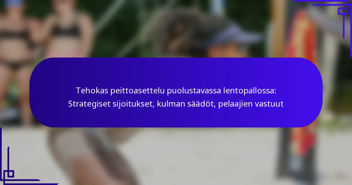 Tehokas peittoasettelu puolustavassa lentopallossa keskittyy strategisiin sijoituksiin, kulman säätöihin ja selkeisiin pelaajavastuisiin. Ymmärtämällä nämä periaatteet joukkueet voivat parantaa puolustustaitojaan ja reagoida tehokkaammin vastustajien hyökkäyksiin.