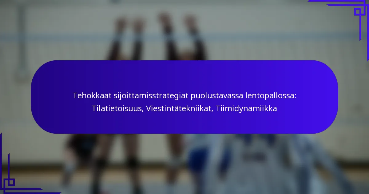 Tehokkaat sijoitusstrategiat puolustavassa lentopallossa perustuvat tilannetietoisuuteen, viestintätekniikoihin ja vahvaan tiimidynamiikkaan. Hallitsemalla kenttäasettelu ja ennakoimalla vastustajien liikkeitä pelaajat voivat merkittävästi parantaa puolustustehokkuuttaan. Selkeä viestintä joukkuekavereiden kesken edistää koordinointia ja reagointikykyä, kun taas yhtenäinen tiimidynamiikka nostaa kokonaissuoritusta otteluissa.