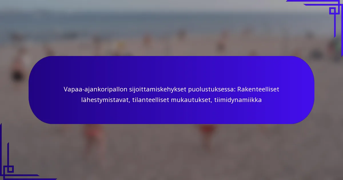 Puolustavan sijoittamisen kehykset lentopallossa tarjoavat rakenteellisia lähestymistapoja joukkueen suorituskyvyn parantamiseksi puolustavissa pelitilanteissa. Nämä kehykset mukautuvat erilaisiin pelitilanteisiin ja korostavat joukkueen dynamiikkaa, varmistaen tehokkaan kenttäkatteen vastustajien hyökkäyksiä vastaan.